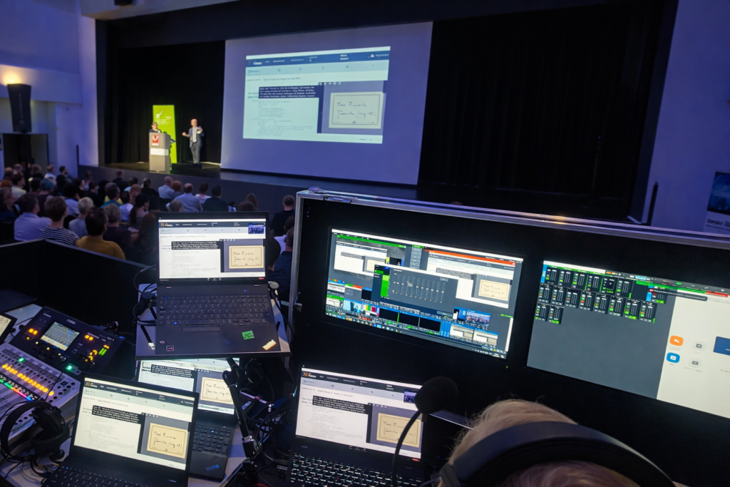 Klassische Simultanübersetzung mit Dolmetscher:innen vor Ort bietet höchste Präzision und Qualität. Besonders bei komplexen oder fachlich anspruchsvollen Inhalten. Wir stellen schallgedämmte Dolmetscherkabinen, Übersetzungspulte, Kopfhörerverteilsysteme und Audioanbindung an die Beschallungs- oder Streaming-Infrastruktur bereit. Die Technik wird so geplant, dass Übersetzung, Bühnensound und Saalmischung sauber getrennt, aber synchron geführt werden. Dies ermöglicht konzentriertes Arbeiten der Dolmetscher:innen und optimale Verständlichkeit für das Publikum.